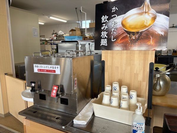 食券を購入すると、厨房に注文が通り、お料理ができると、番号で呼び出されますので、席を決めて待ちます。「かつおだし」は飲み放題なので、セルフで取りに行きます。