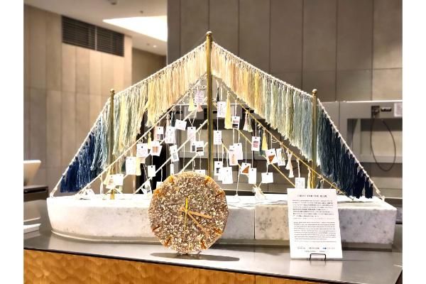 また、エントランスには門司港を拠点に活動する彫刻家、稲葉淋子さんの作品を展示。舟がモチーフとなっている作品の上部から垂らされた無数の糸は宿泊客によって結ばれたもので、小倉織の端材を使用しているそうです。