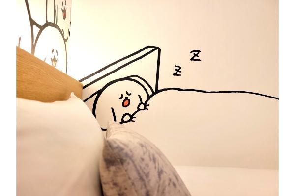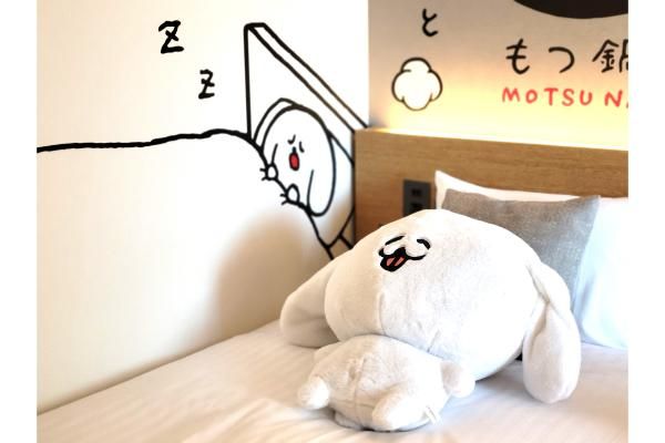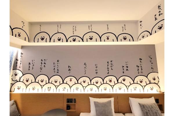 壁には熟睡中のぺろちも! ぺろちが添い寝してくれるので、1人で泊まっても全然さびしくないですよ(ぬいぐるみはフロントで貸し出し予定)。