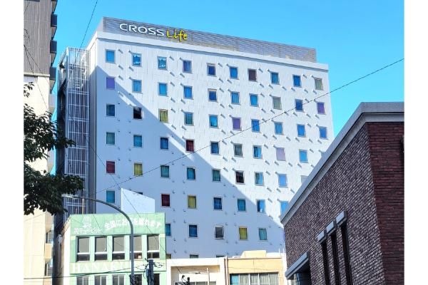 「博多の台所」としても親しまれている柳橋連合市場のすぐ隣に位置するホテル「クロスライフ博多柳橋」。各客室にあしらわれている5色のカラーカーテンが織り成す、博多織をモチーフとしたカラフルな外観が目を引きます。