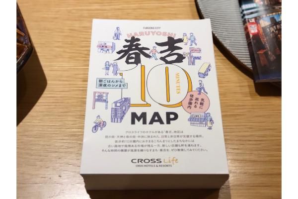 エントランスにはホテルから徒歩10分圏内のグルメ情報を紹介する「春吉 10MINUTES MAP」も設置。