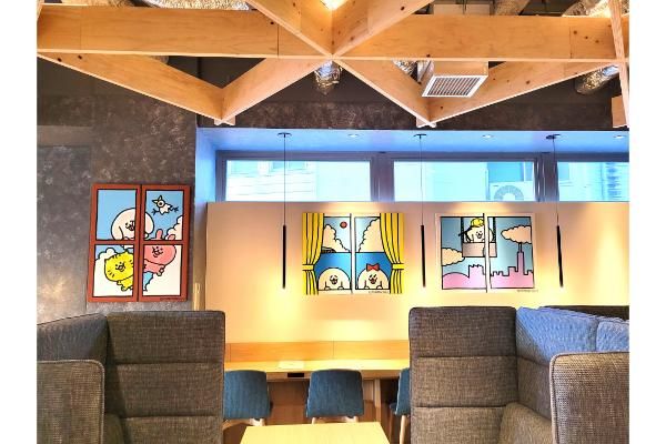 ホテル2階のコミュニティースペースには、パントビスコさんの描き下ろし原画4点も展示されています。
