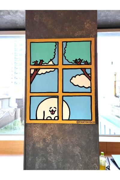 朝は宿泊客の朝食会場として、午前11時からは多目的スペース「360°Hub」として利用される空間に飾られたパントビスコさんの描き下ろし原画は、クロスライフ博多柳橋の特長の一つである「窓」をモチーフにしたもの。