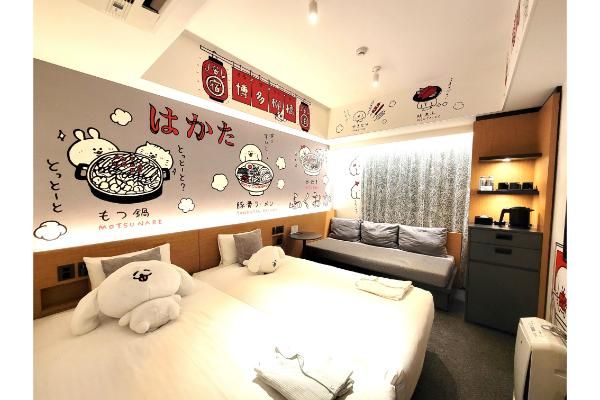 内 容:①『ゆるセリフルーム』1泊室料、オリジナルヘアバンド、オリジナル巾着(全3種から1種)、オリジナルステッカー(全6種から1種) ②『博多づくしルーム』1泊室料、オリジナルヘアバンド、オリジナル巾着(全3種から1種)、オリジナルステッカー(全6種から1種)