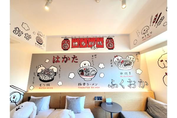 こちらのお部屋も足を踏み入れた瞬間、「かーわーいーいー」と声が出てしまいます。どちらの部屋もそれぞれのかわいらしさがあり、「博多づくしルーム」「ゆるセリフルーム」を1泊ずつ、2連泊での宿泊予約も既に入っているというのも納得です。