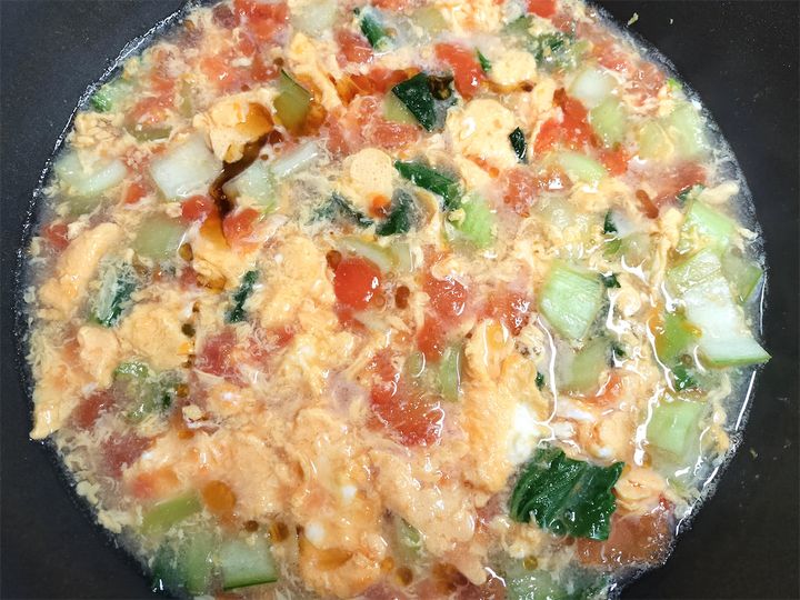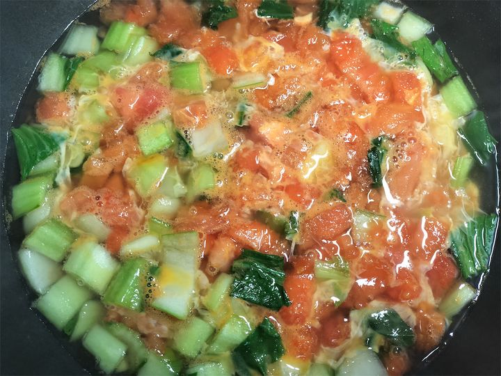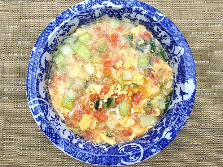 赤に黄色に緑と目にも楽しい一品ですが、飲んでみるととてもやさしい味でトマトの酸味と鶏がらスープの相性がとてもいいことに驚きます。ふわふわの玉子、柔らかいトマト、少しだけ歯ごたえを残したチンゲン菜がどれもやさしい食感で、病気の時でもこのスープを飲んだら元気になるだろうなと思うほどにおいしい味でした。今回用意出来たトマトはけっこう大きめのものでしたが、あまりにおいしくて全部飲んで(食べて?)しまいました。この味がこんなに簡単にできるのなら、中華料理を作るときに一緒に作りたいスープです。
