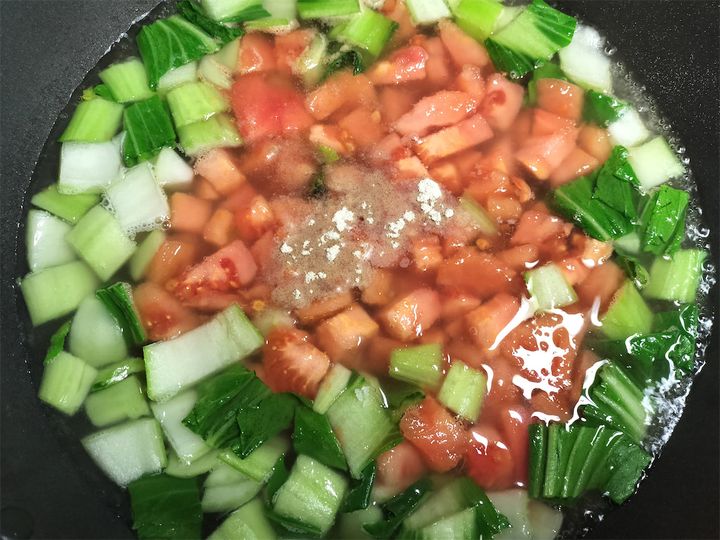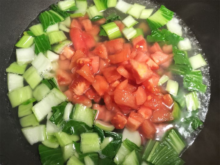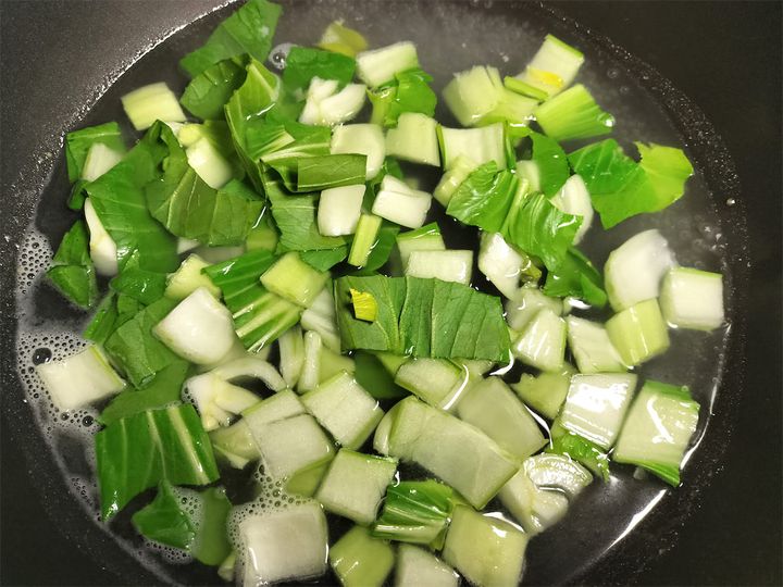 2. 鍋に鶏がらスープとチンゲン菜を入れて中火にかけます。