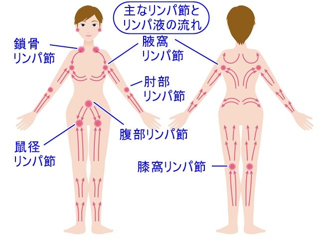 リンパマッサージは代謝の改善、むくみや冷えの解消、老廃物の排出を促す、疲労や凝りの解消などが期待できます。さらに筋肉がほぐれることで正しい姿勢になり代謝がアップします。リンパマッサージは、下の図の矢印の方向に軽く圧をかけながらやさしくさすりましょう。
