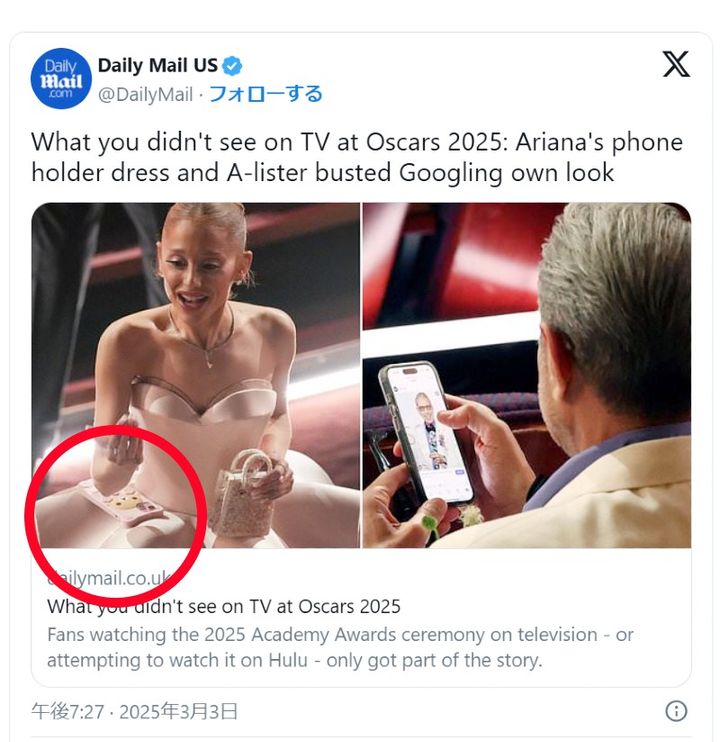 2025年のアカデミー賞授賞式で、アリアナ・グランデが思わぬ形で注目を集めた。彼女の美しいドレスが、まさかの「スマホホルダー」として機能していたのだ。