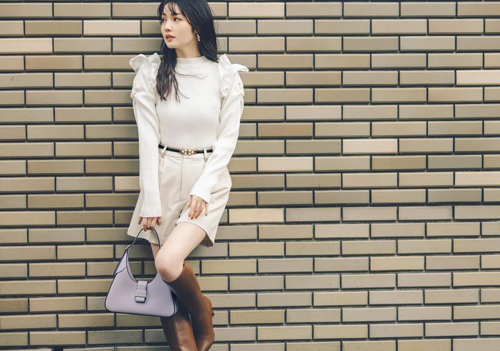 3. オールホワイトでデート映え♡【肩フリル×細リブニットソー】なら華奢見えも叶う