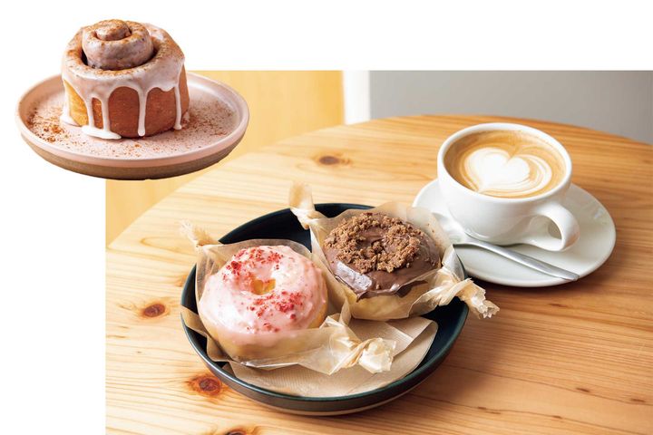 動物性食品を使わず、自家製ヴィーガンバターや豆乳、きび砂糖を素材とした生地を植物性油脂で揚げたドーナツは、ふわっもちっとした食感で軽く食べられる。ヌテラクランチ¥450、ストロベリーグレーズ¥420、カフェラテ¥500/垂れたアイシングのビジュアルも◎なシナモンロール¥420。