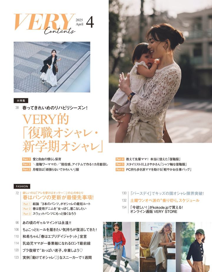 入園・入学、進級に向けた子どもの準備で頭がいっぱいになる時期ですが、少しずつ自分のことにも目を向けてみると気分転換になるかも。慣らし保育や新たな送迎時間が楽しみになるようなファッション情報をVERY4月号では大特集! 現在、絶賛予約受付中です。