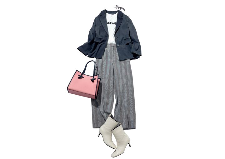 シャキッと見えるモノトーンスタイル。ロンTのしゃれ感のあるロゴがアクセントに。シンプルな辛めコーデだけれど、バッグがピンクなら春めいていい感じ!