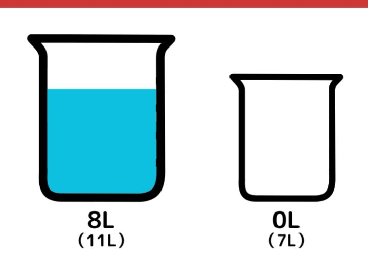 再度11L容器から7L容器に水を移します。7L容器にはすでに4Lの水が入っていたので、3Lの水が移り、11L容器には8Lの水が残ります。