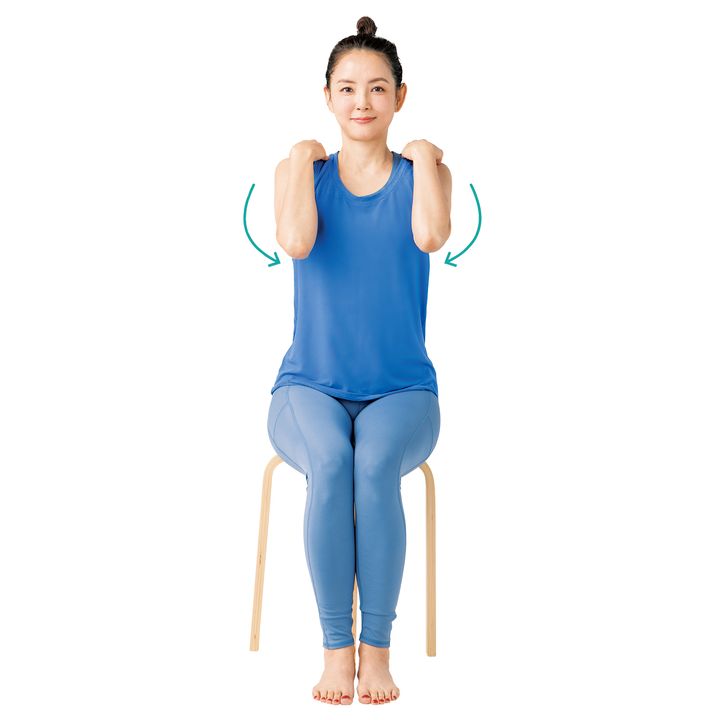 ①両肩に手を置き両肘が胸の前にくるようセット。