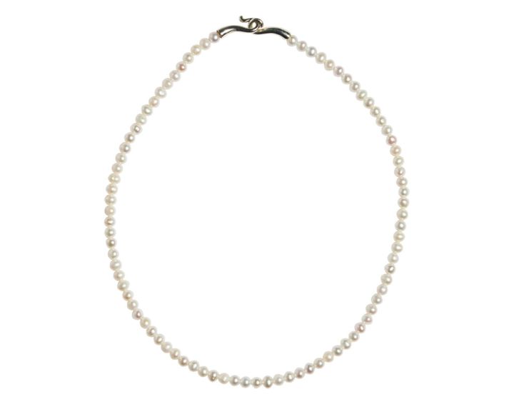 職人により手作業で作られる、センシュアルかつ普遍的な美しさを持つジュエリーを提案する〈ララガン〉。新作のネックレスに使われているのは、柔和な白が肌に馴染む小粒のパール。曲線が個性的なシルバーの留め具は着脱しやすく、後ろ姿もモダンに演出してくれる。首に沿う短めのデザインは、カジュアルな着こなしにも似合う。