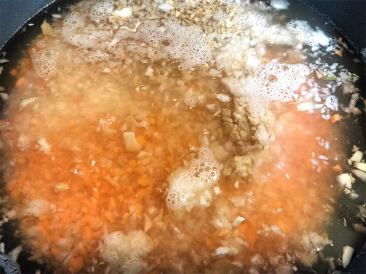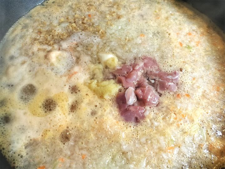 4. 沸騰したら中火にして、鶏肉、にんにくを加えます。