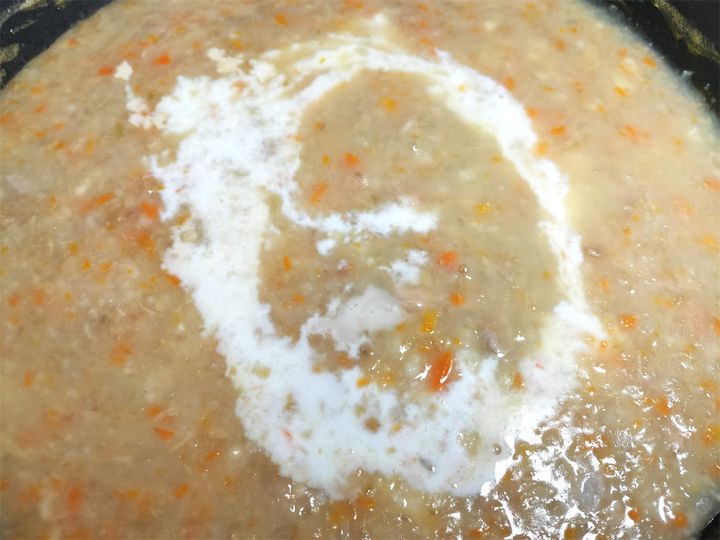 6. 2で作っておいたルウを少しずつ濾しながら、とろみがつくまで加えて溶かします。