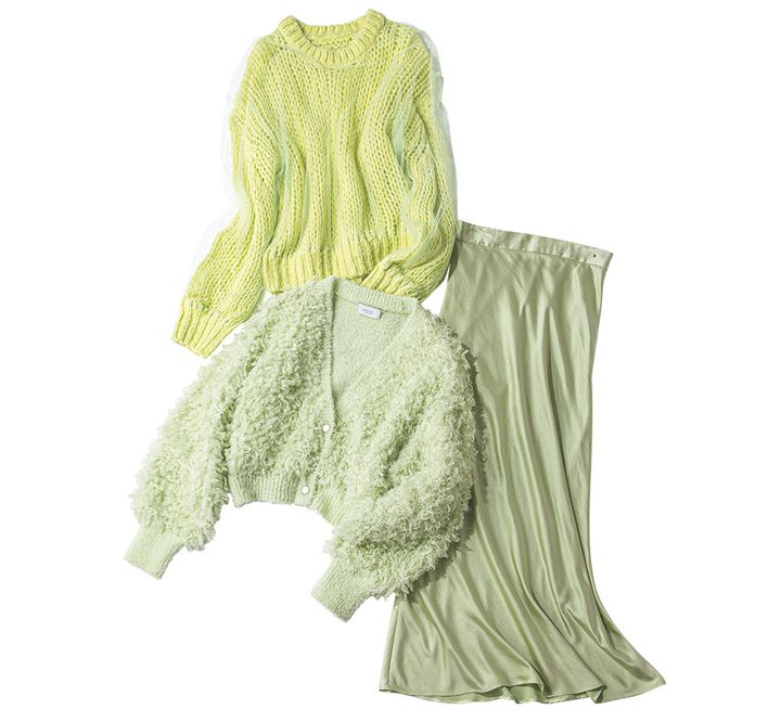 【挑戦的グリーン】で自分を刷新! 今まであまり挑戦したことのないグリーンなどの冒険色も、’25年はどんどん取り入れたい気分。 一色投入するだけで、今っぽさがグッと増量します。