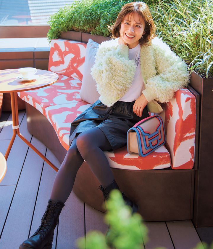 カーディガン¥18,700(emmi/emmi ニュウマン新宿店)Tシャツ¥17,600(サードマガジン)パンツ¥29,700(サクラ/インターリブ)バッグ¥202,400(ピエール アルディ/ピエール アルディ 東京)ブーツ¥60,500(ツル バイ マリコ オイカワ)ピアス¥22,000(ブランイリス/ブランイリス トーキョー)タイツ¥1,320(靴下屋/タビオ)