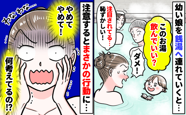 銭湯で2歳の娘が「お湯飲んでいい?」一斉に注目され赤面!ダメと言うとまさかの行動に出て顔面蒼白