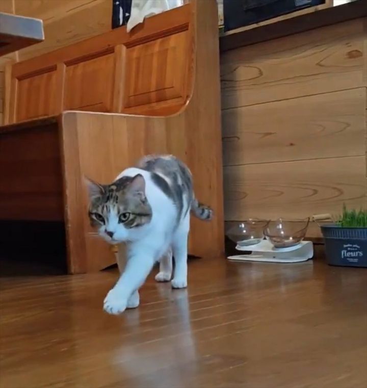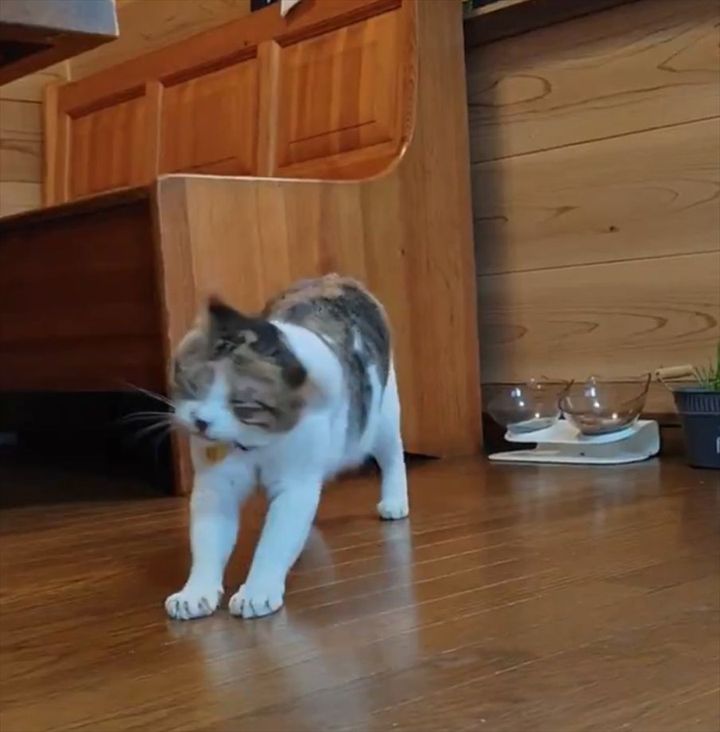 食事を終えたところなのか、食器を背にゆっくりと歩いているのは、愛猫の『テン』ちゃん。