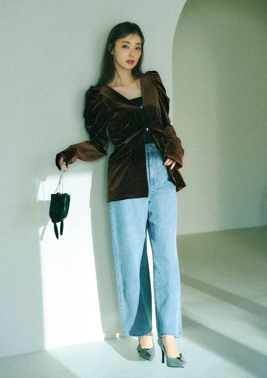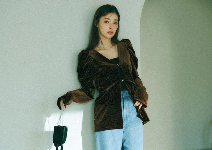 ベロアジャケット¥16,500/ジユウバイラベルエチュード デニムパンツ¥12,650/31 Sons de mode( ヒロタ) イヤリング¥3,960/KRONOS(ロードス) ネックレス¥30,800/ミチ ウィルウェイ(フォーティーン ショールーム) バッグ¥9,900/ロニ パンプス¥18,700/ダイアナ(ダイアナ 銀座本店) ベアトップ/スタイリスト私物