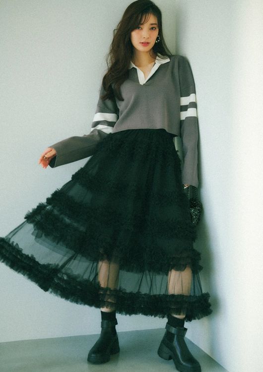 襟付きニット¥19,800/カデュネ チュールスカート¥17,600/ガールズソサエティ イヤリング¥3,400/KRONOS、リング[右手]¥11,000/G.R(ともにロードス) バッグ¥72,600/アンテプリマ/ワイヤーバッグ(アンテプリマジャパン) ブーツ¥22,000/プラス ダイアナ(ダイアナ 原宿店)