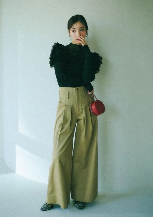 折り目正しいワイドチノで甘盛りフリルを受け止めて