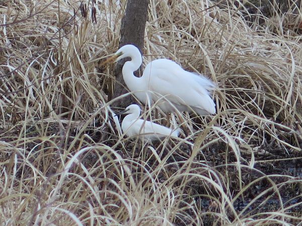 大きさと、寄り添っている様子から親子かとも思ったのですが、特徴からしてダイサギとコサギ でしょうか。