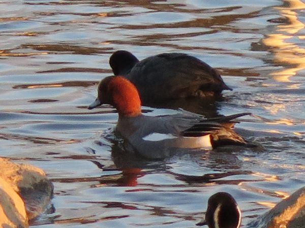 ヒドリガモ。 赤褐色の頭と黒白の体の配色がオシャレな鴨です。