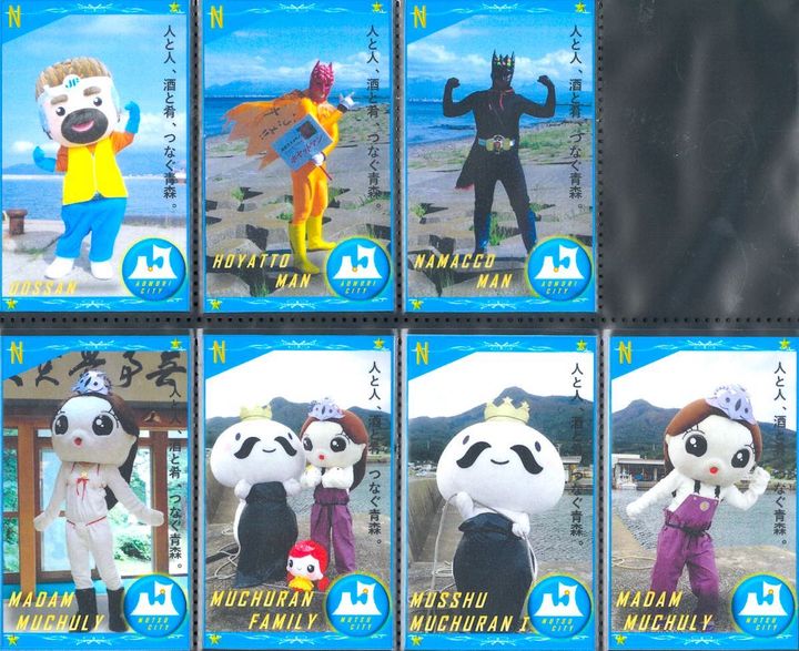 青森市「DOSSAN」、青森市「HOYATTO MAN(ホヤットマン)」、青森市「NAMACCO MAN(ナマッコマン)」、むつ市「マダム・ムチュリー(母)」「ムッシュ・ムチュランI世(父)」「プリンセス・ムチュリン(娘)」ファミリーのご当地キャラクターたち
