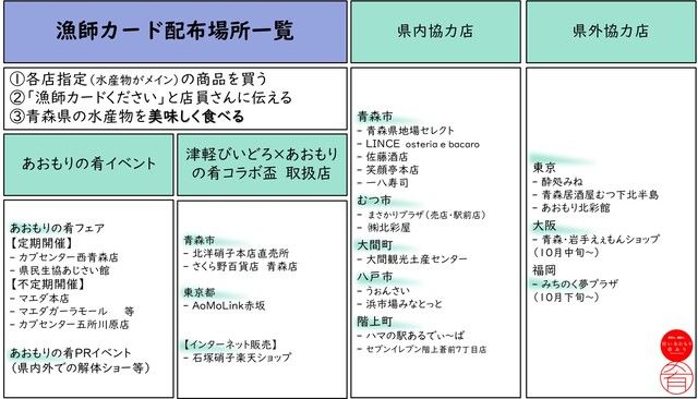 カードは「あおもりの肴フェア」や県内外での解体ショーなど、「あおもりの肴」によるPRイベントをはじめとして、漁師カードの趣旨に賛同する県内のお土産店や飲食店などで配布されています。県外でも、東京や大阪、福岡の青森県のアンテナショップや青森の食材を楽しめるお店などでも入手できます。