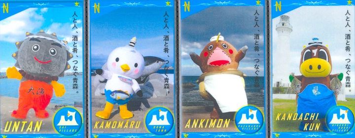 佐井村「雲丹(うんたん)」、大間町「かもまーる」、風間浦村「あんきもん」、東通村「かんだちくん」のご当地キャラクターたち