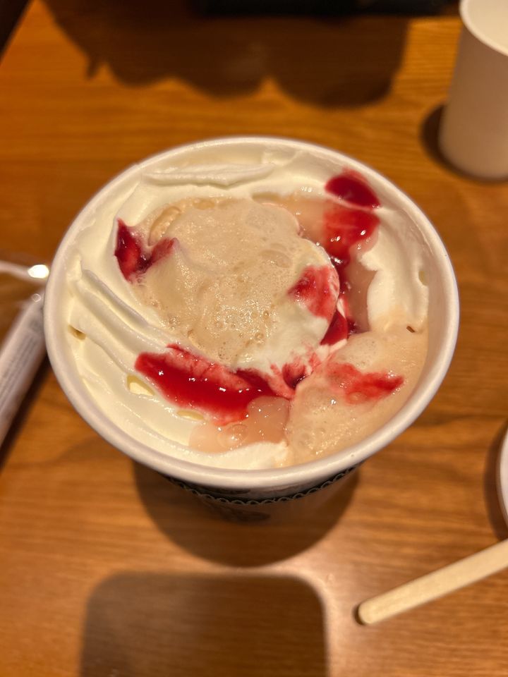 優しい甘みのロイヤルミルクティーにホイップとバニラ風味の桃ソース、ラズベリーソースが合わさり、まるでスイーツの「ピーチメルバ」のようなフルーティな味わいが楽しめるドリンクです♬
