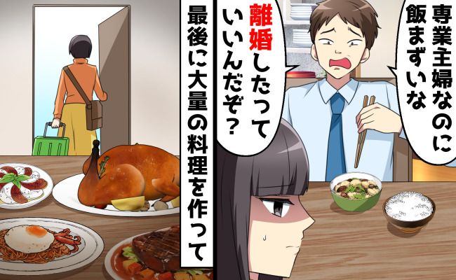 その翌日、私が調整して少し濃い味にした料理も夫には合わなかったようで、「なんだよこれ! ちっとも変わってないじゃん。相変わらず専業主婦なのにメシまずいな! こっちは離婚したっていいんだぞ?」と罵声を浴びせてきます。