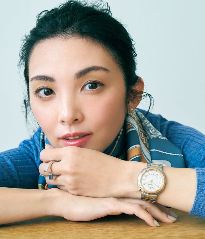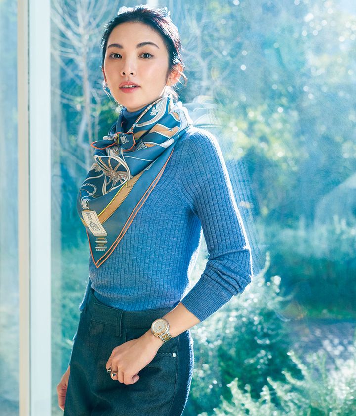 時計「エルメス カット」〈18KPG × SS、36㎜、自動巻き、18KPG × SSストラップ〉¥2,178,000ピアス(18KPG × DIA)¥724,900リング(シルバー)¥172,700首に巻いたスカーフ¥88,000(すべてエルメス/エルメスジャポン)ニット¥53,900パンツ¥86,900(ともにドゥロワー/ドゥロワー 二子玉川店)