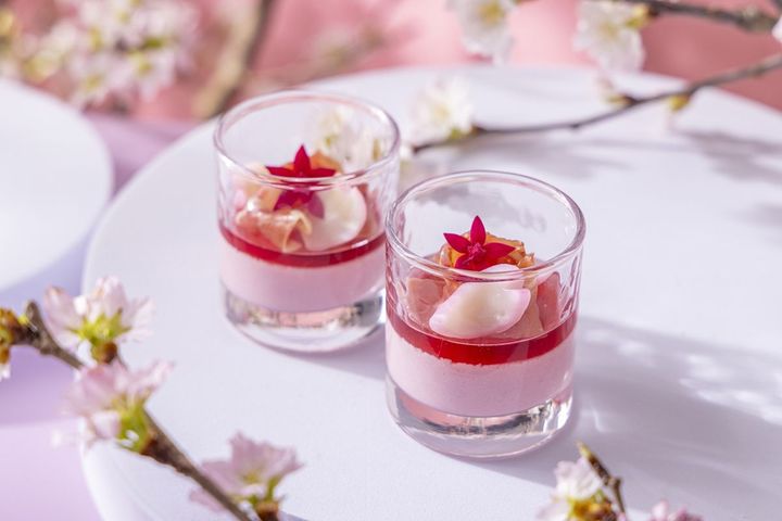 ビーツで色付けをしたまろやかな口当たりのヴィシソワーズに、桜ピューレをのせてアクセントをプラス。生ハムと花びらに見立てた百合根のトッピングで満開の桜を表現。