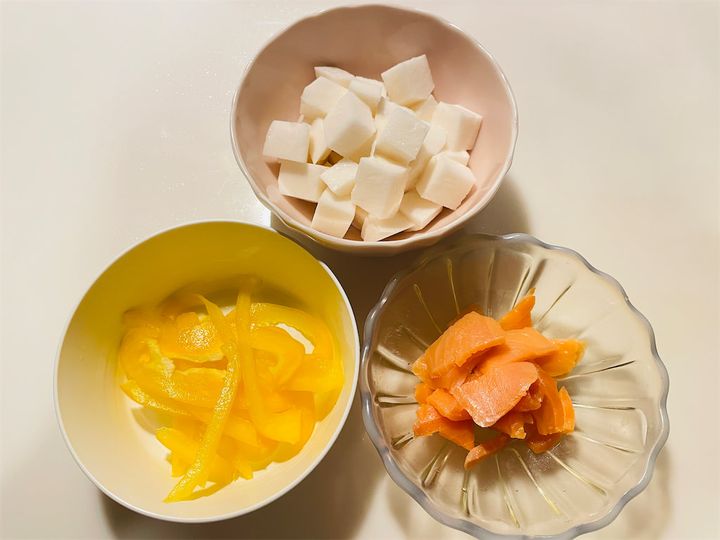 2.長芋は1cm角に切り、パプリカは薄切り、スモークサーモンは食べやすい大きさに切る。