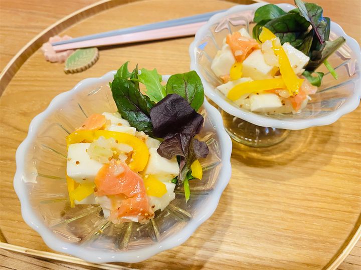 また、パプリカの代わりにミニトマトを半分にしたものや、角切りきゅうりなど、生野菜ならなんでも合いそう♪
