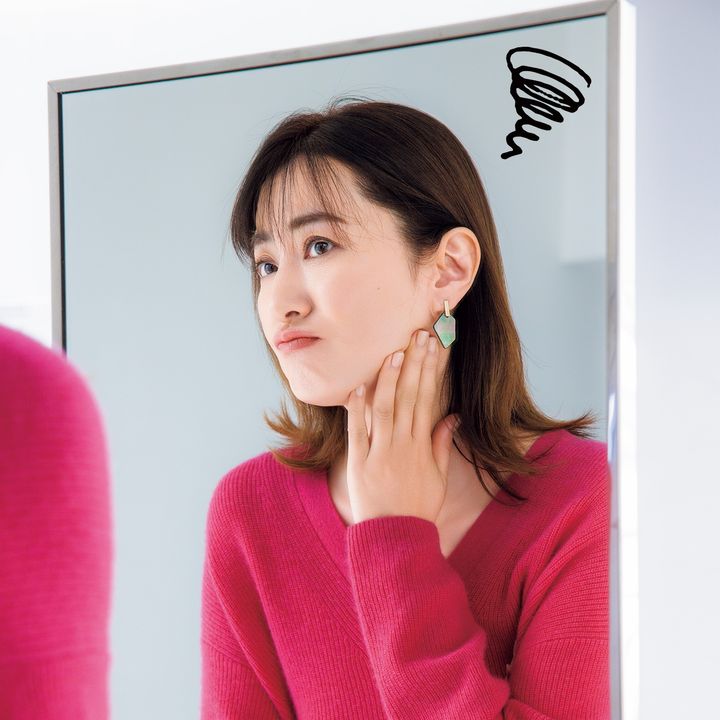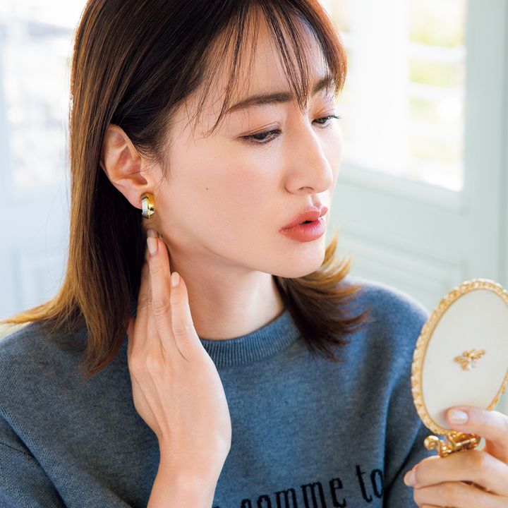 ニット¥88,000(ブランベール/ウールン商会)デニムパンツ¥39,600(ニードバイヘリテージ/ゲストリスト)ピアス¥7,830(アビステ)