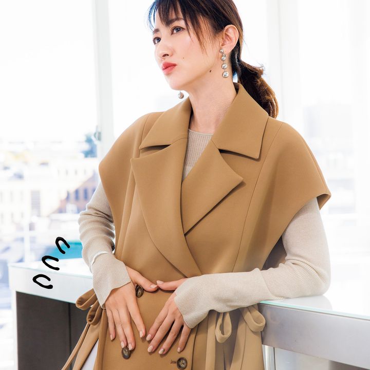 ジレ¥39,600(アルページュストーリーオリジナル/アルページュストーリーオリジナル プレスルーム)ニット¥14,960(インディヴィ/ワールド プレスインフォメーション)パンツ¥14,300(ステートオブマインド/ゲストリスト)イヤリング¥6,480バングル¥4,620(ともにアビステ)