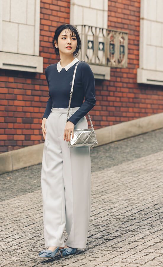 デイリーボトムのコーディネートに、今季豊作のデザインニットソーが大活躍! ハイウエストのワイドパンツには、襟付きニットソーで上品に女っぽさをプラスして。