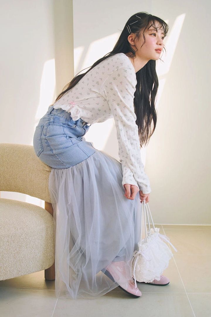 デニムチュールスカート 20,900円/HONEY MI HONEY ピンク小花柄カットソー 15,180円/lilLilly(lilLilly TOKYO)バッグ 8,690円/TINA:JOJUN スニーカー 14,300円/PUMA(atmos pink flagship Harajuku店)ヘアピン/スタイリスト私物