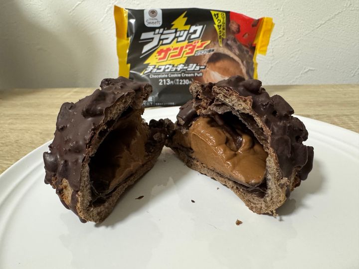 出典:MORE 【商品名】ブラックサンダーチョコクッキーシュー【価格】213円(税込230円) ふんわりとしたシュー生地の上にクッキー生地がのっていてゴツゴツとした見た目!クリームがとろっとしていて、絶妙なクッキーのザクっと&ジャリっと食感がたまらない!