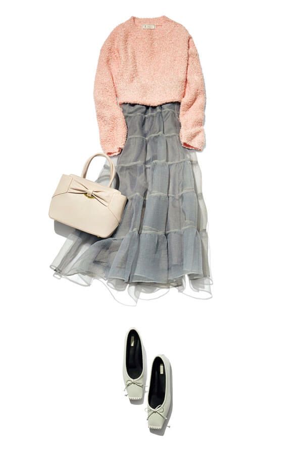 人気のピンク×グレー配色を、パステル流行りの春はひとひねり。シアー素材越しにグレーを感じるスカートとの柔らかいトーンにすると、ひときわ新鮮なルックスに。