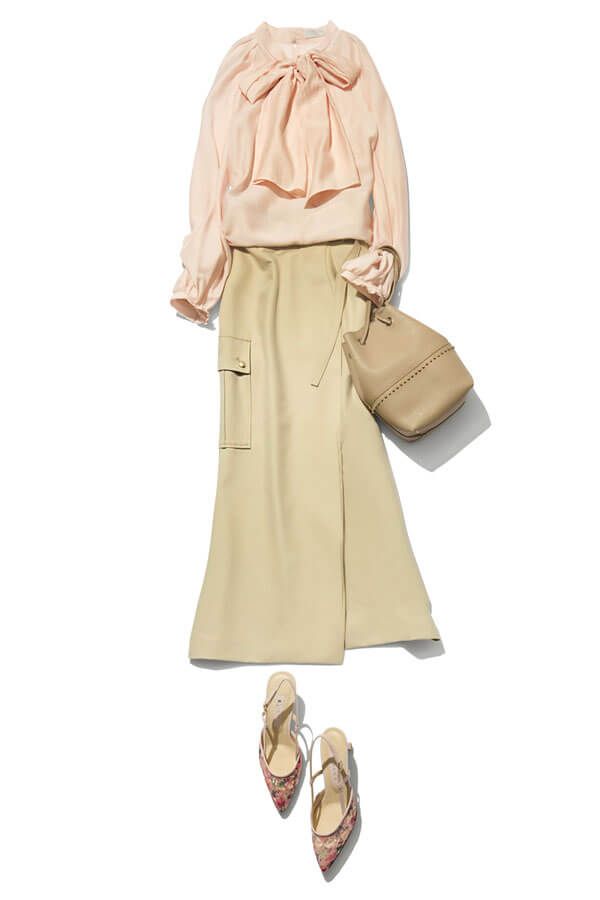 上下どちらも黄みを含んでいて地続きにつなぎやすい2色だから、まとまりよくスッキリとした着こなしに。ブラウスの大きなボウタイや靴を彩る花柄でフェミニンな甘さを盛るのが、春っぽさを高めるコツです♪