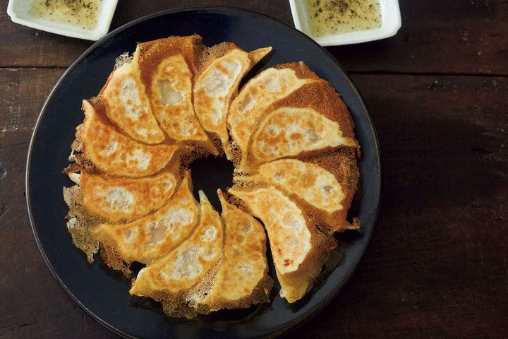 (4)ピチピチと音がしてきたらふたを取り、ごま油小さじ1/2を回し入れてこんがりと焼き色をつける。フライパンより大きめの器をかぶせ、フライパンごと返して餃子を取り出す。残りも同様に焼く。酢と粗びき黒こしょうを混ぜて餃子に添える。