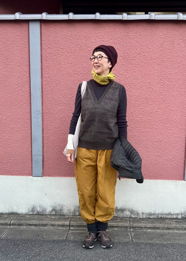 岩手で買ったウールマフラーのきれいなマスタードカラーがポイント。上着を脱ぎながら、「今日はおじさんルックですよー」とおどけてみせてくださった山口さん。トップスは、無印の首がチクチクしないニットと、飽きが来ないから何年もきているというマーガレットハウエルのメンズベスト、ボトムスはもんぺ。「洋服選びは、とにかく着心地重視です。お店に行くのって、この歳になってもまだ緊張しませんか?」