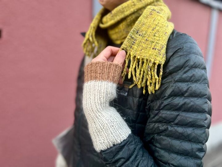 「冬は首という首を温めます」という山口さん。ホームスパンのウールマフラー、「プエンテ」のアームウォーマーとレッグウォーマーでしっかり防寒。どちらも上質な素材で、軽くて暖かそう。冷えには「首」を温める。これは、もはや大人世代の鉄則です!